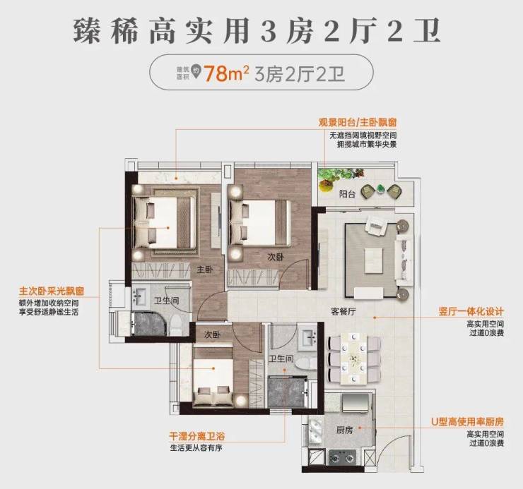 约78㎡做真三房设计,是白云市场同等面积段里少见的方正三居。户型功能性齐全、实用率高,满足购房时对生活的美好畅想。
