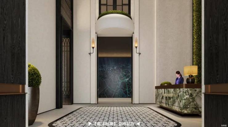 三进:【南洋秘境】会所前厅,让业主的每次归家,都仿佛一步跨入南洋秘境,8米挑高前厅,铺设威尼斯水波纹玉石拼花,石材纹理模拟珠江水系脉络,拼花接缝暗合“九曲来水,玉带环腰”贵脉格局。