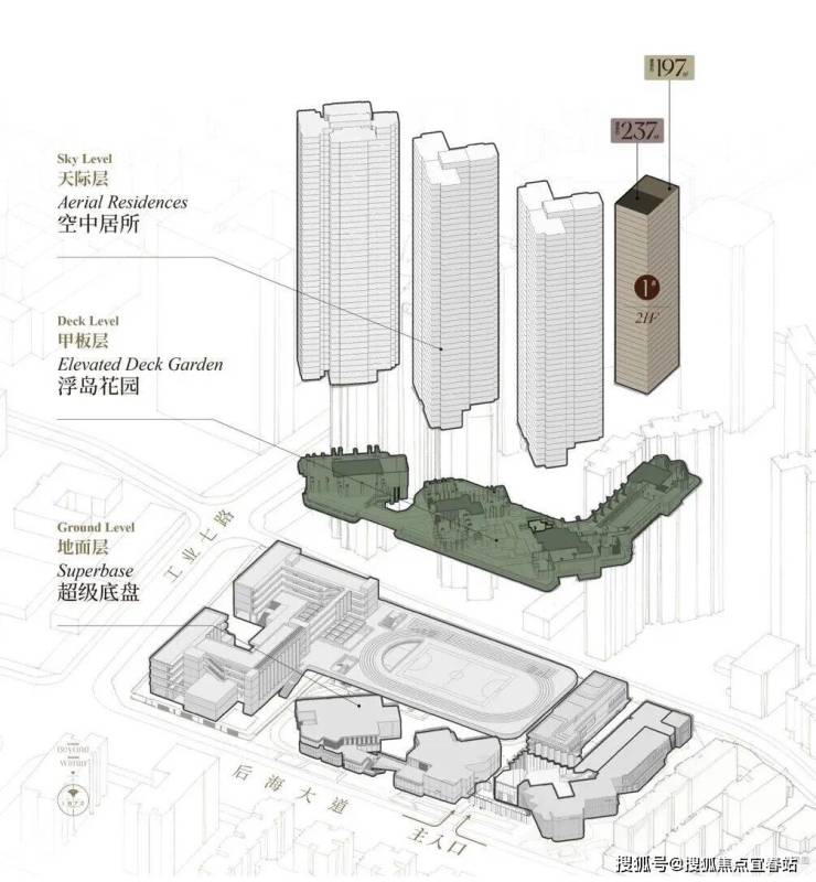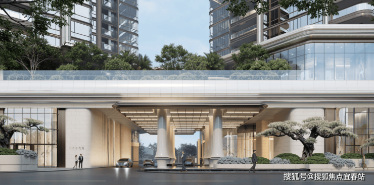 第一重是“浮岛甲板”的立体折叠。项目创新采用了“浮岛甲板”设计概念,在纵向上将生活进行切分:甲板之下,向城市打开,与都会的繁华无缝连接;甲板之上,则是抬高的隐逸园林,将喧嚣彻底隔绝于脚下。这道物理上的高差,划定了一条“入世”与“出世”的优雅界线。