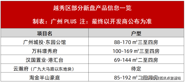 比如,广州城投·东园公馆,主打88-170㎡三至四房;万科璟秀府,主推100-169㎡三到四房;汉国置业·港汇台,推出69-144㎡二至四房......