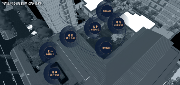 项目参考《姑苏繁华图》为背景,将清代苏州城的繁华盛况融合现代景观元素,提炼出「磐石、层林、云影、云亭、清流、翠台」六大场景,每个区域都展现着独特的设计理念和艺术氛围,并传递出居住环境的生态氛围。