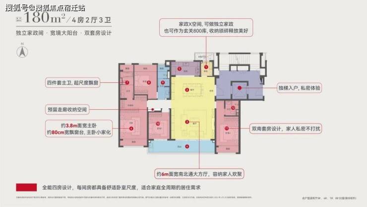 在优越的空间利用率面前,其它闪光点都成了锦上添花。但基本上市场大平层必备的要素,ta都有——标配大横厅、标配洄游结构、标配动静分区、真南北通透等等。