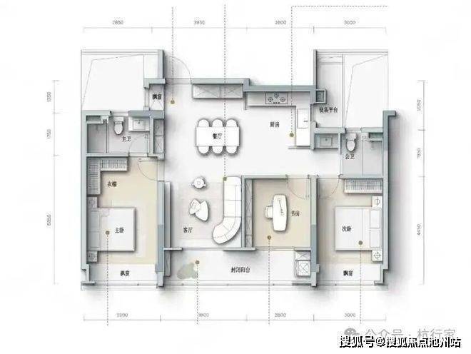 105㎡(A1户型):入门级刚需户型,独立玄关+800库收纳系统,S型墙体实现嵌入式冰箱,南向双卧带飘窗,主卧配独立卫浴与衣帽间,小空间兼顾功能与仪式感2。