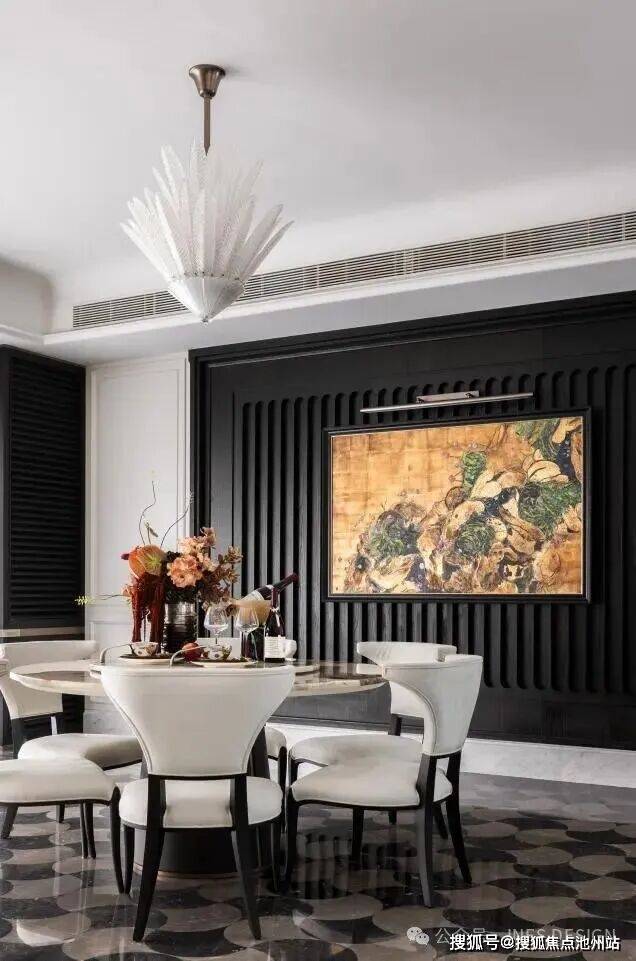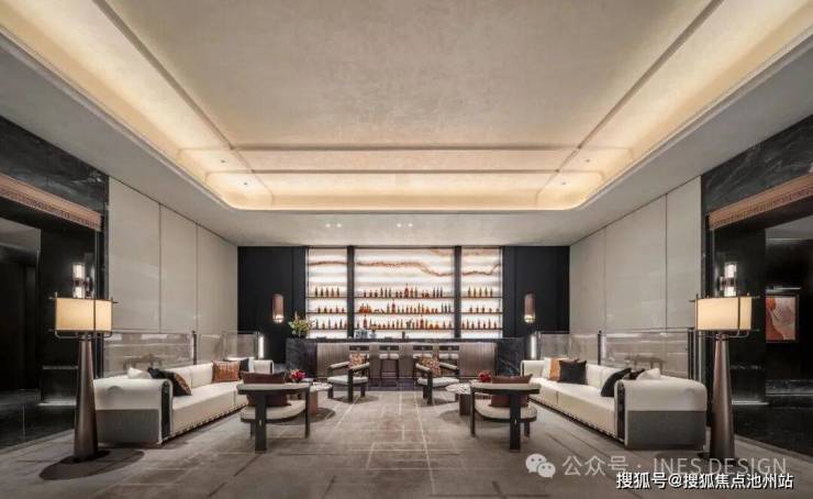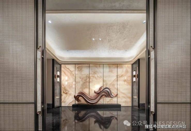 家具风格:现代东方美学线条,多人位沙发采用普拉达绿奢石的扶手+米色皮革拼接,茶几台面选用林海雪原天然奢石结合精致金属底座,形似吴越漆器方盒。