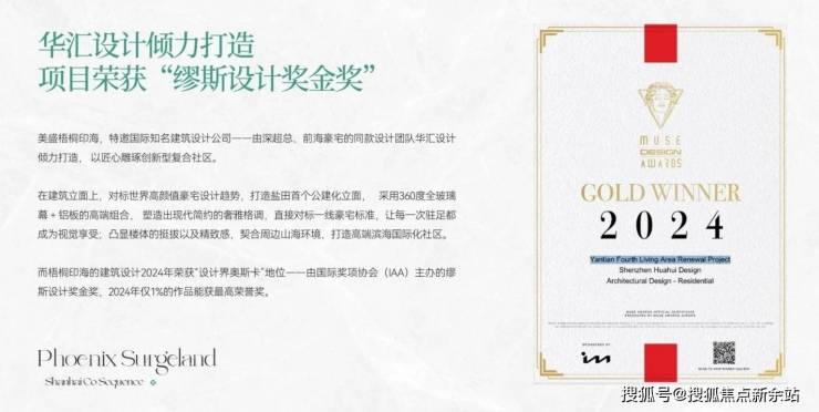 项目特邀深超总/前海豪宅同款设计团队华汇设计操刀建筑,其作品从全球近3.8万件中脱颖而出,斩获有“设计界奥斯卡”之称的2024年国际奖项协会(IAA)缪斯设计奖金奖——该奖项仅约1%作品能获最高荣誉。