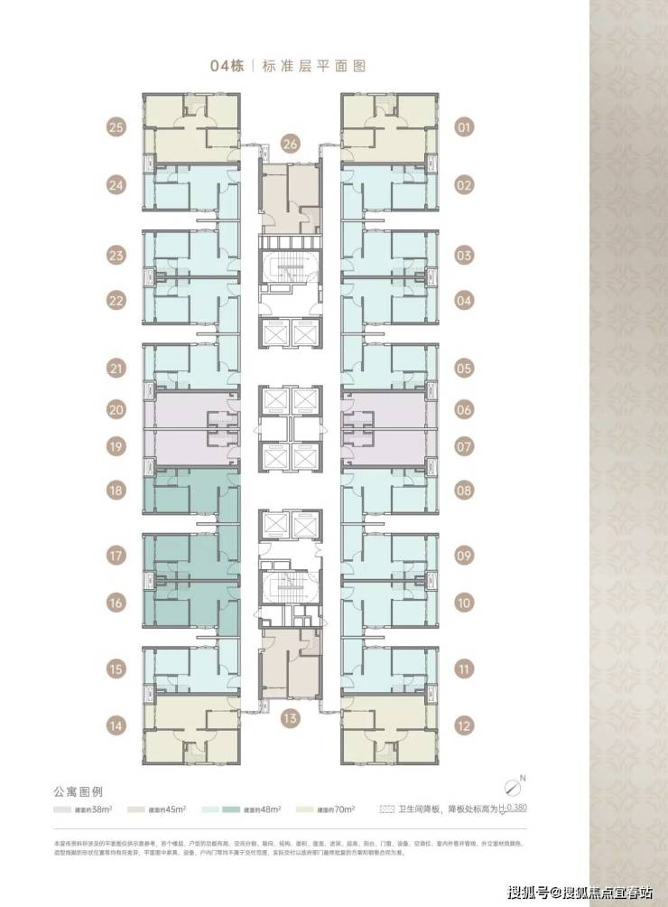 住宅由4栋48层建筑组成,分别是1栋、2栋1/2单元和3栋,3梯5/6户,4栋是商务公寓45F(1470户),5栋是幼儿园。