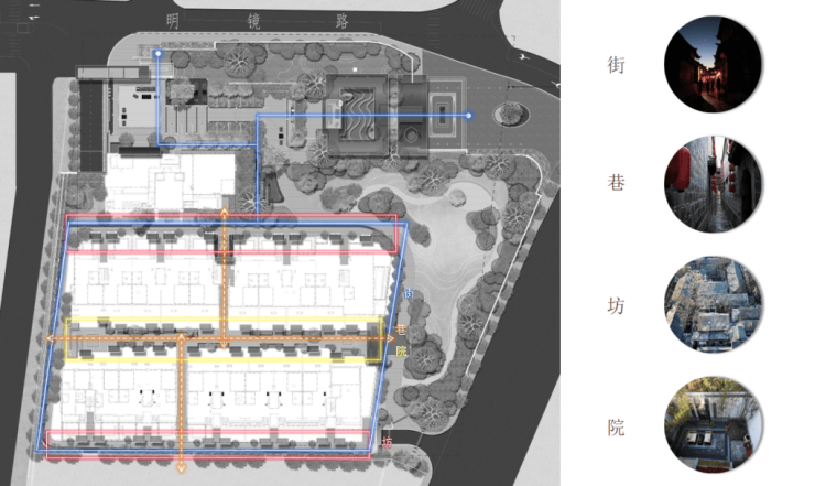 通过府门-坊门-户门三重空间进阶,勾勒归家仪式轴线;因地制宜形成错落有致的园林景观,结合行人步道、下沉庭院、入口广场等组团空间,打造多层次、多形态的游玩体验,造就丰富、私密的园林空间,仿若“蝉噪林逾静,鸟鸣山更幽”。