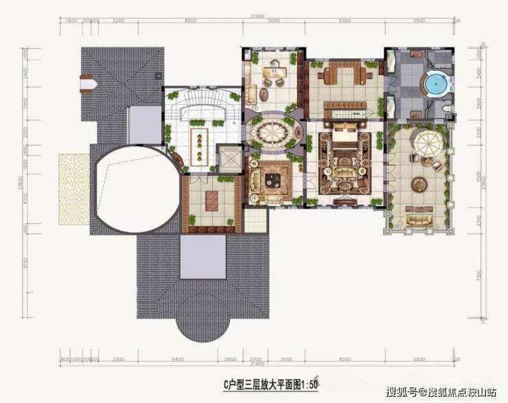 别墅三层可以打造为男女主人尊崇私密套房系统,主卧、书房、起居室、衣帽间一应俱全,女主人衣帽间就有十几平米,尺度阔绰;3层配有开间5.5米、进深10米的超大露台,层峰生活怡然尊享。