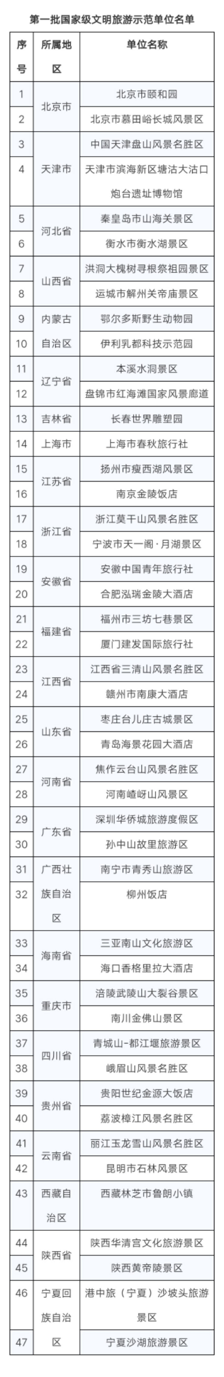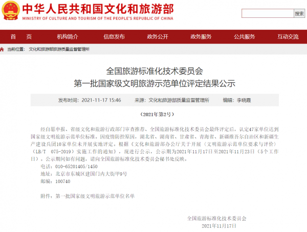 2021年11月17日文化和旅游部官网消息,全国旅游标准化技术委员会对排名前列批高级文明旅游示范单位评定结果进行公示,认定47家单位达到高级文明旅游示范单位标准。公示全文如下。