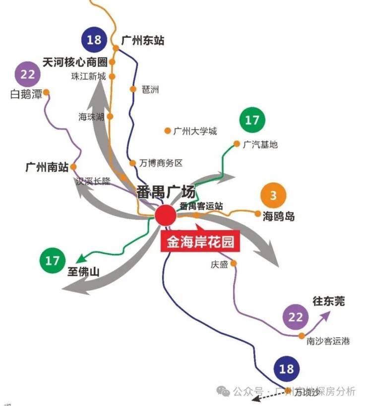 项目距离地铁3号线东延段傍江站仅500米,1站直达番禺广场(可换乘18/22号线),2站至万博CBD,4站达珠江新城,五轨交汇(含规划中的17号线)覆盖全城通勤。