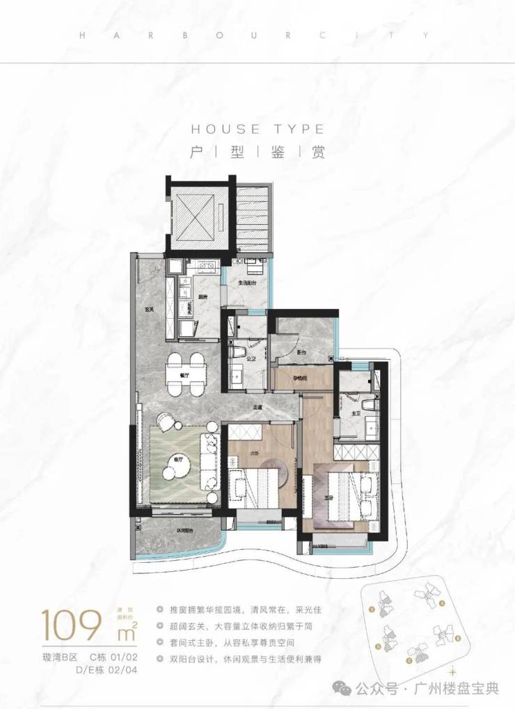 建面109平三房,是项目最小的户型,做到三开间朝南,面向开阔的园林,视野景观非常不错。
