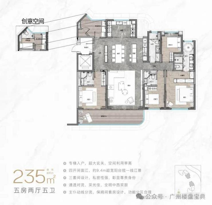 建面161平五房,超阔入户花园,南北对流双阳台,而且江景面更加开阔,而且还做到了双主套设计。