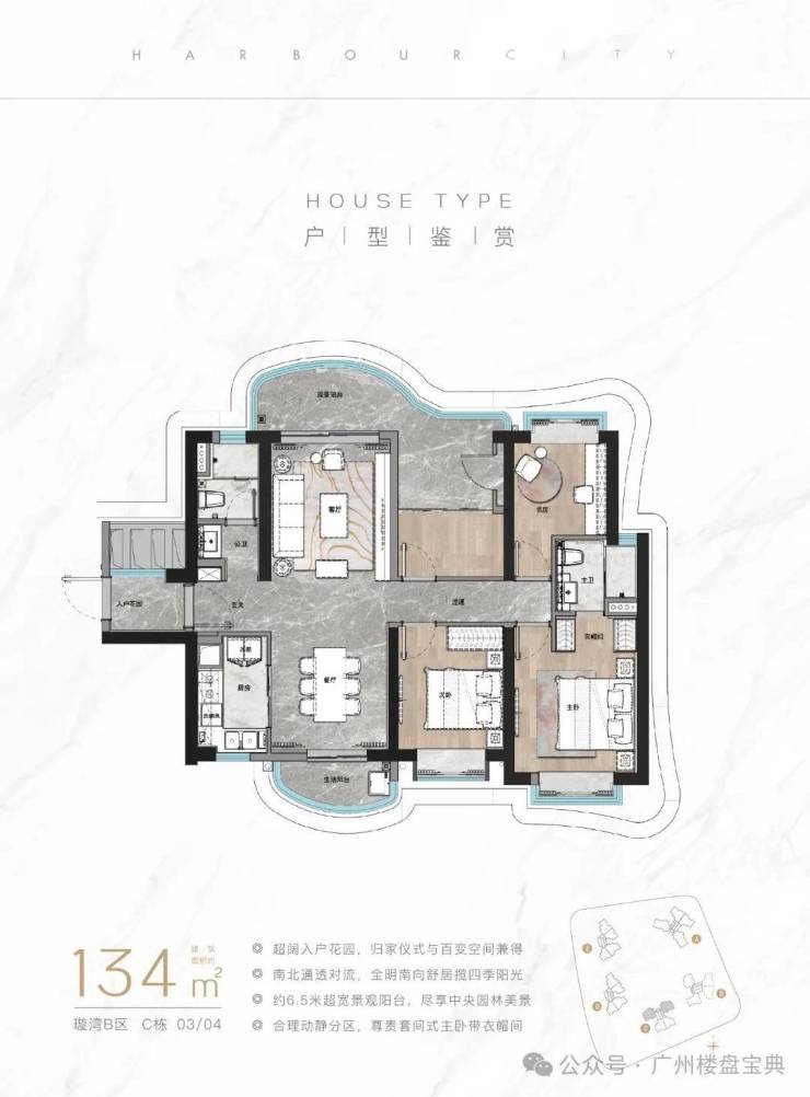 建面134平四房,带超大的入户花园,南北对流双阳台设计,景观阳台长达6.5米的开阔度,还有套间式主卧。
