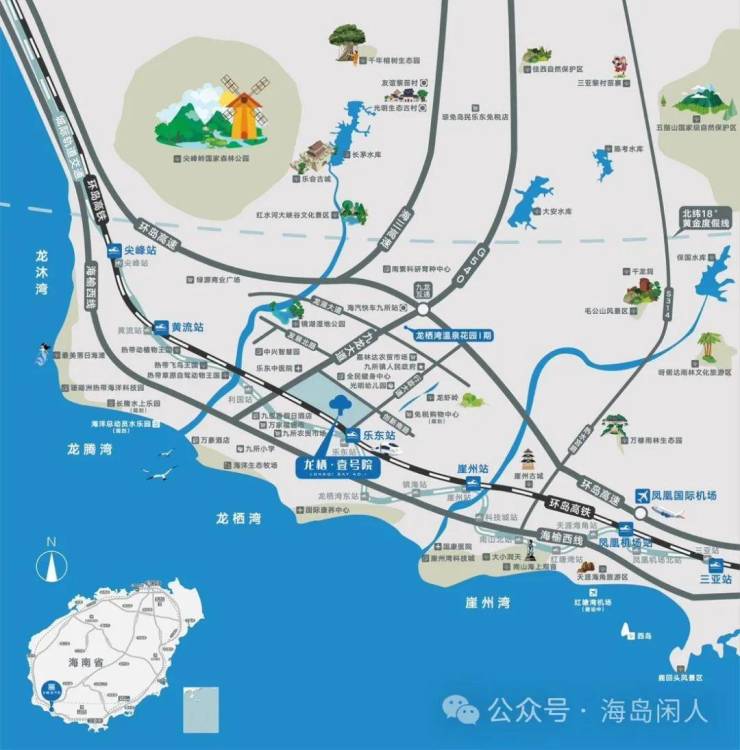 5、10分钟咫尺三亚:项目距海南环岛高铁站/轻轨站(预计2023年6月底建成通车)仅约500米,高铁乐东站到崖州站约10分钟,到三亚站约20分钟,抵达凤凰机场只需19分钟;5分钟至海南(G98)环岛高速,海三高速直通三亚。