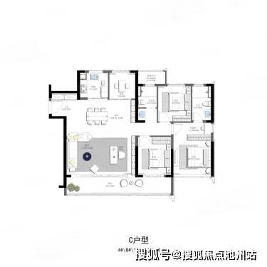 114 ㎡的户型都是三室两厅两卫,四开间朝南,餐客卧一字排开,整体面宽约 11.7 米,而餐客厅宽达 5.6 米。