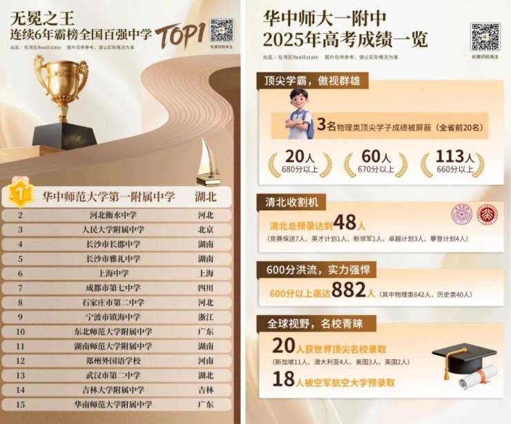 🥇同源全国名校华中师大一附中,2023年高考一本上线率近100%,2024年600分率攀升至96%,清北录取人数超60人,清北录取率7%以上,被誉为“清北摇篮”,为区域带来优质教育。