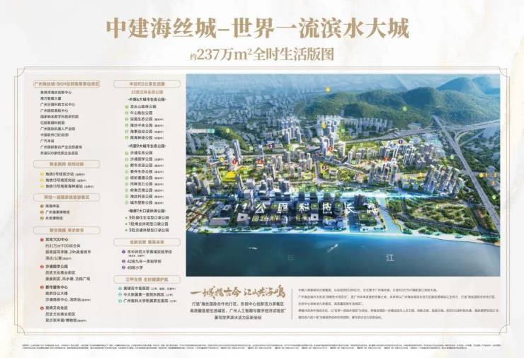 🌟背靠龙头山麓,南向瞰揽珠江盛景,中建海丝城坐拥得天独厚的生态基底。板块整体规划2 大城市生态矩阵、22 座城市公园群落,涵盖 6 大市级生态公园、9 大特色主题公园、7 个精致口袋休闲园。