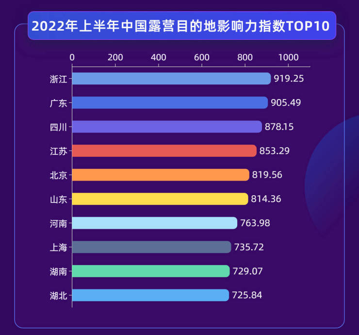 基于对全国31个省(直辖市、自治区)的露营产业的关注度指数、传播力指数、竞争力指数的综合分析与计算,2022年上半年中国露营目的地影响力指数前10名地区是:浙江省、广东省、四川省、江苏省、北京市、山东省、河南省、上海市、湖南省、湖北省。