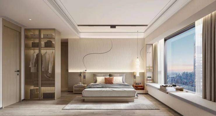 其中,主卧采用酒店式套房设计,且带有270°转角大飘窗,视野阔绰。