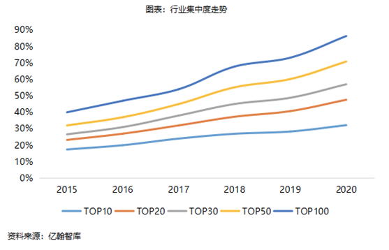 同时,各梯队房企销售业绩门槛值均创历史新高。亿翰智库数据显示,2020年TOP10房企门槛值为2892亿元,同比增长19%;TOP30房企门槛值为1306亿元,同比涨幅达13%;TOP40房企门槛值破千亿元,涨幅达12%。