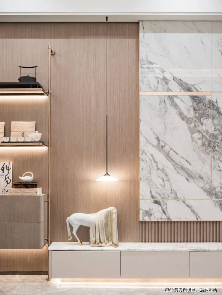 精选钢木复合门、臻选雅艺壁布、自然木饰面、全景一体化岩板背景墙等精奢材质,搭配充满仪式感的氛围灯带、打磨移门、踢脚线、过门石等每一处细节。