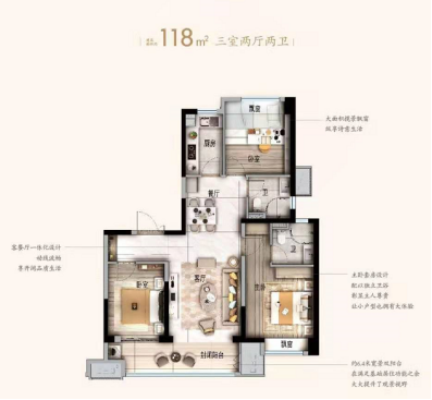 本户型较大亮点是超高空间利用率。建面约118m²的户型在空间上做到与130㎡相同的功能,较大限度改为3房功能,并且设有两卫设计,双飘窗,宽景阳台,三面朝南采光充足,主卧套间设计,不仅有着四季景观视野,同时超大的室内面积也能满足男女主人对于生活的所有需求。