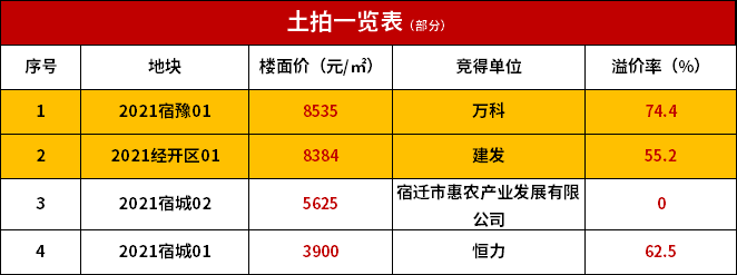 其中宿豫区出让的一宗土地(2021宿豫01地块)被万科所得,楼面价8535元/㎡,出让面积11.2124万㎡,成交总价22.0099亿,溢价率74.4%;