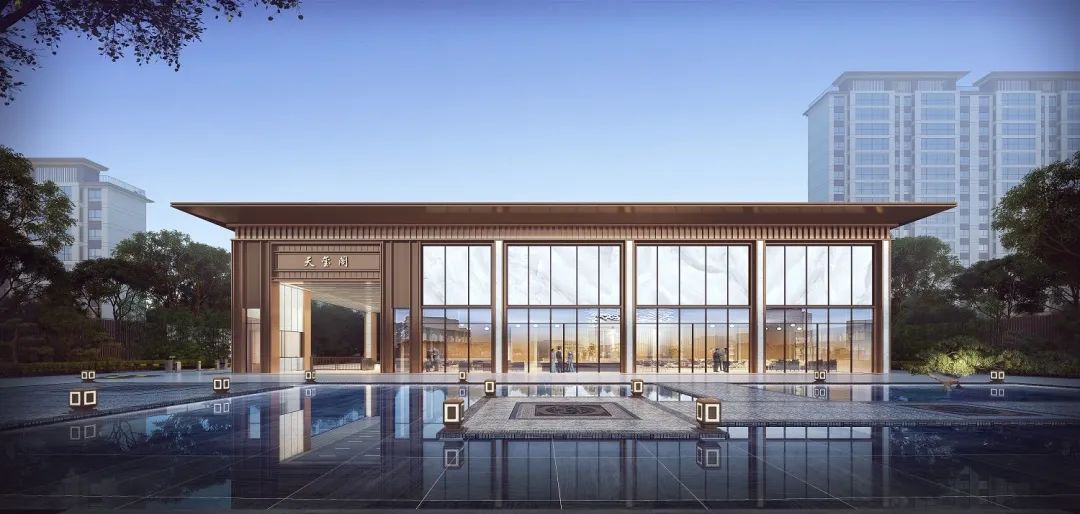 一进享门庭之礼,朗阔入户门约28米宽5米高,中式屋檐,呈现中轴对称布局。