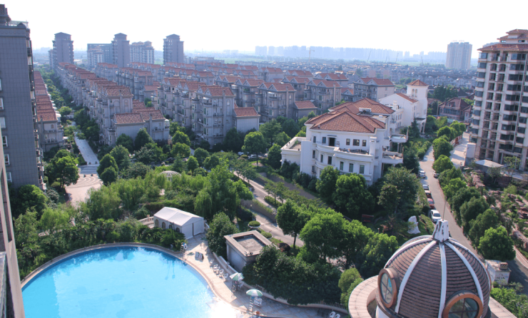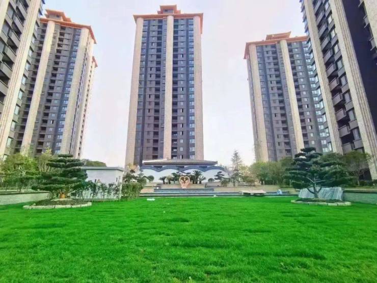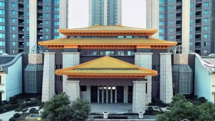 泗泾绿中海占地4.7万方,由9栋16-30层的新中式住宅组成。项目外立面采用的是天然石材和真石漆,屋顶采用四面斜坡设计。