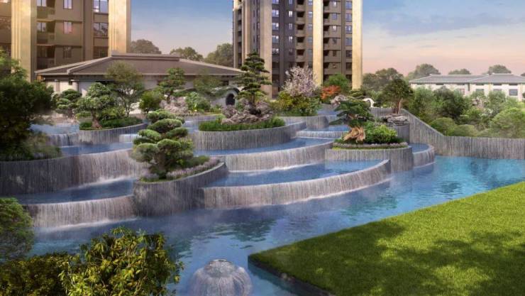 社区内部植被丰富,设置众多艺术雕塑、景观休闲步道、中央景观层叠式水瀑布、儿童游乐场等。
