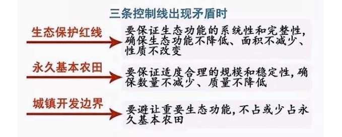 三条控制线出现矛盾时,生态保护红线要保证生态功能的系统性和完整性,确保生态功能不降低、面积不减少、性质不改变;永久基本农田要保证适度合理的规模和稳定性,确保数量不减少、质量不降低;城镇开发边界要避让重要生态功能,不占或少占永久基本农田。目前已划入自然保护地核心保护区的永久基本农田、镇村、矿业权逐步有序退出;已划入自然保护地一般控制区的,根据对生态功能造成的影响确定是否退出,其中,造成明显影响的逐步有序退出,不造成明显影响的可采取依法依规相应调整一般控制区范围等措施妥善处理。协调过程中退出的永久基本农田在县级行政区域内同步补划,确实无法补划的在市级行政区域内补划。