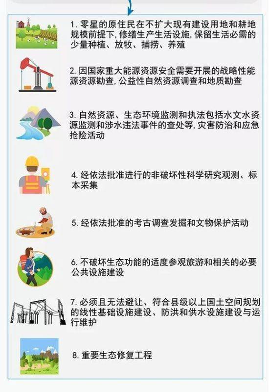 生态保护红线内,自然保护地核心保护区原则上禁止人为活动,其他区域严格禁止开发性、生产性建设活动,在符合现行法律法规前提下,除国家重大战略项目外,仅允许对生态功能不造成破坏的有限人为活动,主要包括:零星的原住民在不扩大现有建设用地和耕地规模前提下,修缮生产生活设施,保留生活必需的少量种植、放牧、捕捞、养殖;因国家重大能源资源安全需要开展的战略性能源资源勘查,公益性自然资源调查和地质勘查;自然资源、生态环境监测和执法包括水文水资源监测及涉水违法事件的查处等,灾害防治和应急抢险活动;经依法批准进行的非破坏性科学研究观测、标本采集;经依法批准的考古调查发掘和文物保护活动;不破坏生态功能的适度参观旅游和相关的必要公共设施建设;必须且无法避让、符合县级以上国土空间规划的线性基础设施建设、防洪和供水设施建设与运行维护;重要生态修复工程。