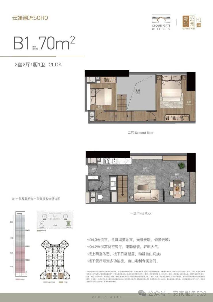 清晨在约4.3米云幕客厅喝咖啡赏云门公园全景,夜晚在挑高卧室拥星入眠——约70㎡的空间,装得下年轻家庭的多重理想生活