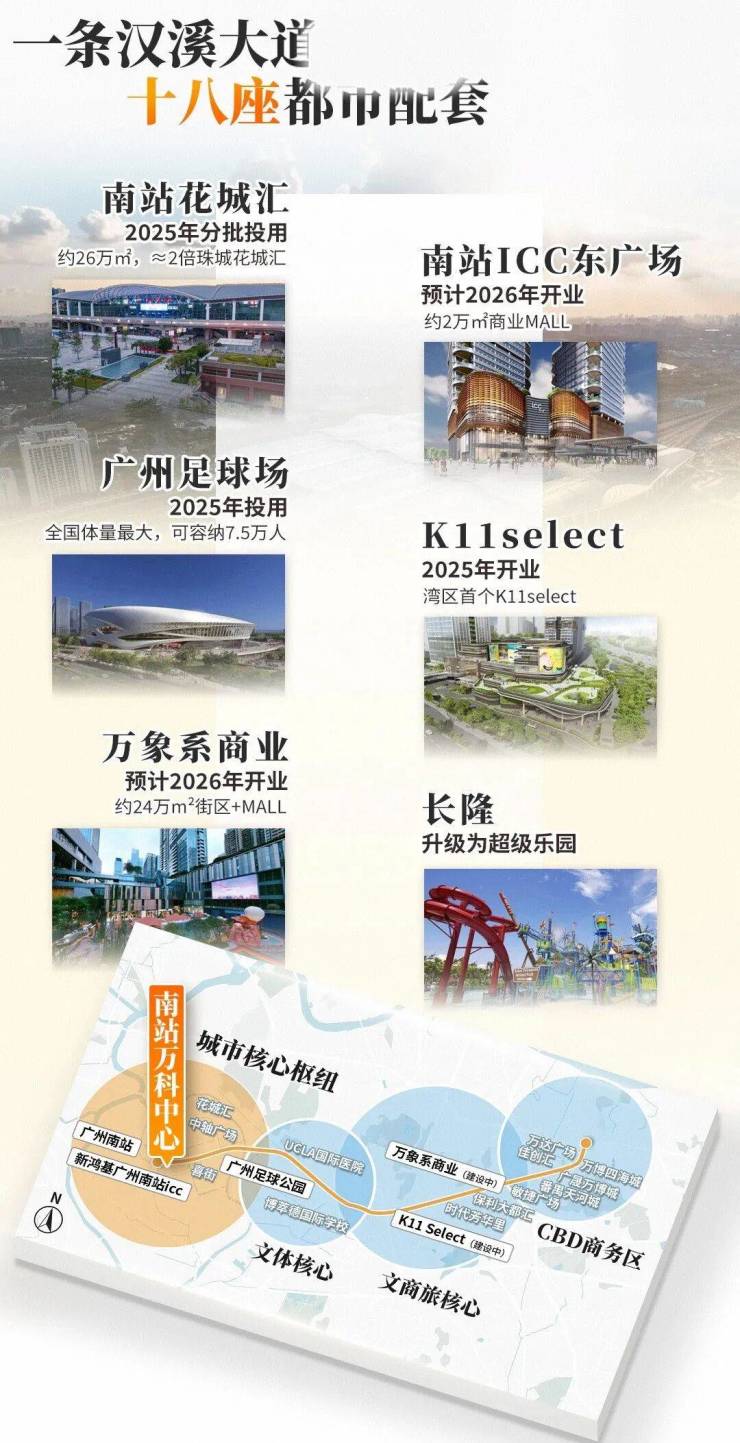 广州南站更是串联万博、长隆两大板块,以“超级枢纽+超级商圈”模式平移都市中心,南站8km范围聚集番禺70%的经济总量、70%的常住人口,拥有前沿的产业体系+集中的商业配套+宜居的生态资源+高效的通勤速度,是番禺最适合生活居住的组团,打造广州不可复制的“黄金动脉