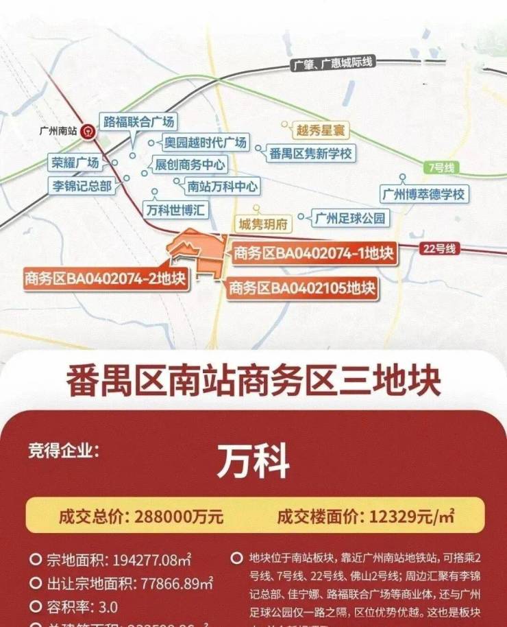 2024年12月17日,万科以底价28.8亿拿下广州南站商务区三宗宅地,总面积约23万㎡,折合楼面价约1.1-1.3万/㎡。