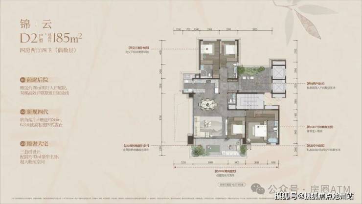 建面140㎡的户型更夸张:实得建面182㎡,不仅做了双套房设计,还配了约51㎡的“旋转方厅”,既能当家庭社交中心,也能拆分出独立空间;而建面185㎡的户型,实得直接冲到252㎡,不仅有三套卧、约18米南向面宽,还带挑高中庭庭院,相当于把“别墅感”搬进了高层里。
