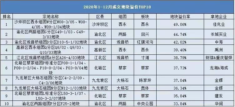 在2020年重庆成交地块溢价率TOP10里面,西永组团不仅占据了排名前列的位置,还在其中占据了2席之地,而这个较高溢价率又被这次的土拍刷新了达到了57.6%