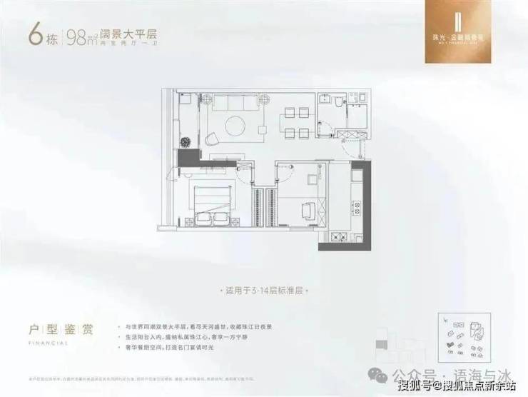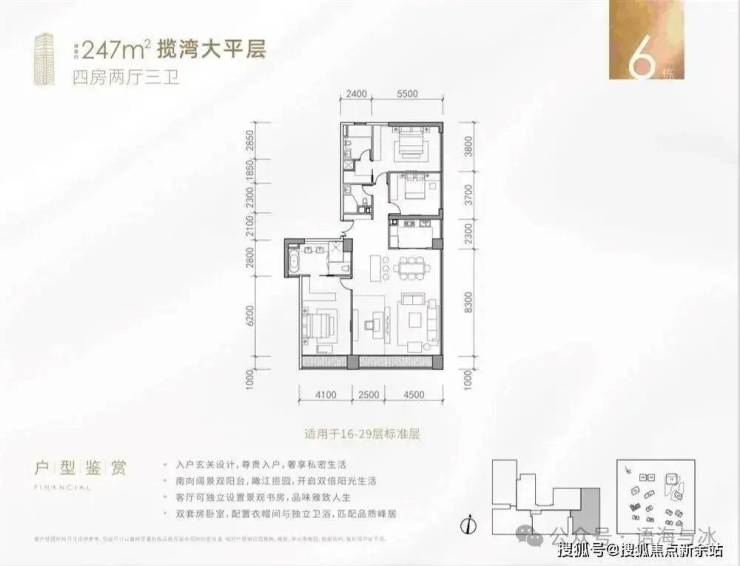 产品方面,项目提供多样化高端住宅配置,满足不同层级的生活需求。叠墅产品位于7栋与10栋,面积区间240-310㎡,为城市中轴线上罕有的南向首排一线江景叠墅,空间层次丰富,居住私密性强;大平层分布于6栋高区至低区,面积段覆盖79-400㎡,其中高区单位具备270°观景视野,尽揽珠江壮阔与小蛮腰天际;中低区单位则打造实用型江景住宅,面宽设计极致优化,5开间朝南,13米以上阳台面宽,营造超阔观江视界。loft公寓位于5栋,面积段为41-110㎡,买一层送一层,精装交付,是市场稀缺的投资型优质产品。另配备写字楼产品,单层面积达1060㎡,整体约4万㎡,匹配城市总部级办公需求,成就金融城商务新地标。