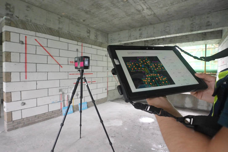 例如,地面整平机器人、抹平机器人、抹光机器人在刚浇筑完的混凝土泥浆内作业,经过它们的平整与配合,混凝土面层每平米的高差可以控制到2毫米内,满足业内超高精度标准要求。再如,测量机器人只需2-3分钟即可完成一个房间的实测作业,测量效率较人工提升2到3倍,并自动化生成报表,测量结果更客观,也更准确。
