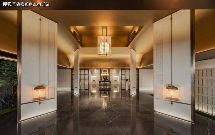 大厅前是一个高阔的空中艺廊,层高约4.2米,铺就白色温润玉石,用料奢华。