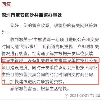沙井街道办官方给出回复是,没有相关文件强制性要求公布建设进度,一切以合同为准。