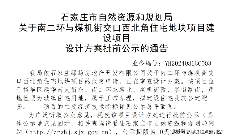 近日,石家庄市自然资源和规划局发布了《关于南二环与煤机街交口西北角住宅地块项目项目设计方案批前公示》,项目由石家庄绿筠房地产开发有限公司报建申请,位于裕华区建华南大街东,南二环东路北,煤机街西,塔南路南。