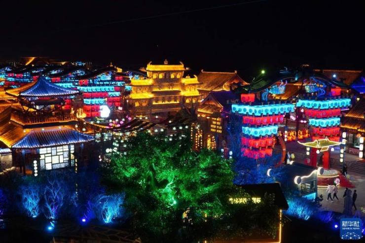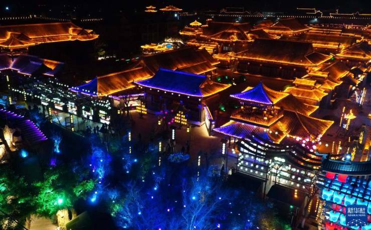 2月27日拍摄的位于山东省东平县的大宋不夜城夜景。大宋不夜城是山东省东平县集古镇风情与宋文化街区于一体的全新旅游项目。大宋不夜城从今年1月7日正式向游客开放以来,已吸引游客超过110万人次,对繁荣夜经济、拉动消费起到有效促进作用。新华社记者徐速绘摄