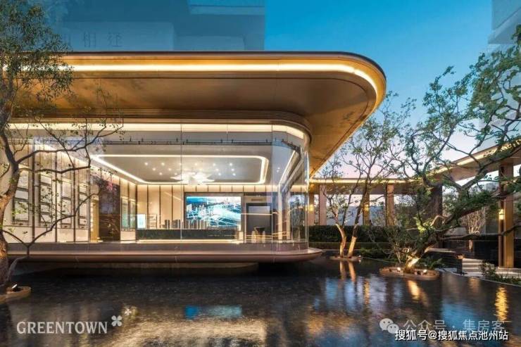 主入口知·云栖,取意西湖十景以"洄游"为理念,超52米跨度的回字形布局,重构传统"四水归堂"空间序列,约2.4米“流光礼宾” 塔冠,如悬浮的美学灯塔,与金色挑檐相映成辉,全封闭式阳台勾勒建筑轮廓,让立面如镜幕般收纳约30公里江岸鎏光!