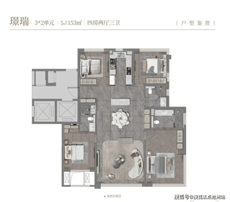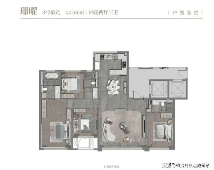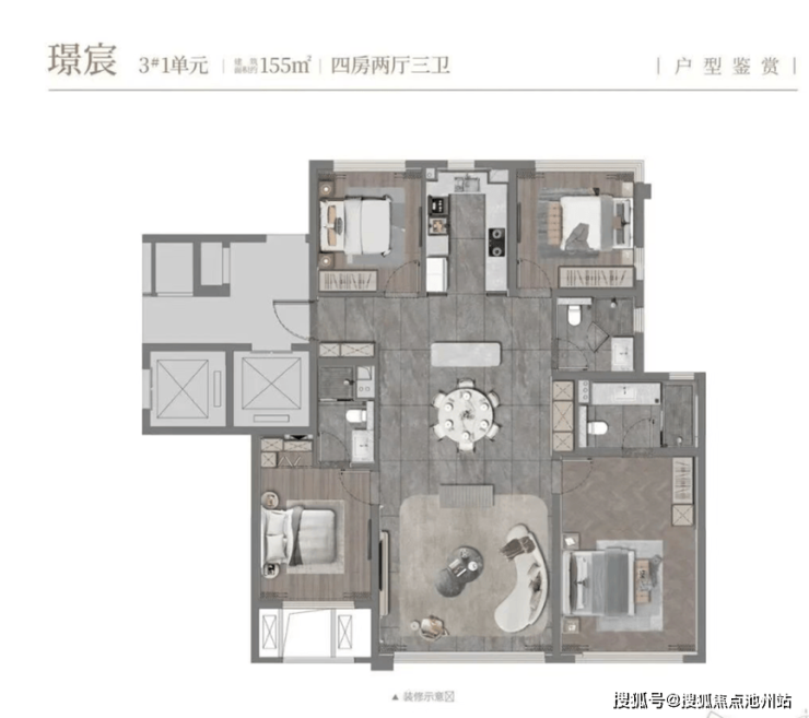 3号楼一共30层,1层架空,为153和165平的大户型,与武珞路平行,北面规划为商业、商务以及公园绿地用地,不会收到遮挡,北面楼下为露天泳池,南面会小区中心园林及会所,153平两户结构一样,都是四叶草型四房三卫双套房设计,功能性做的非常足,东边户可能合同面积略小于中建衔接胡,且在主卧设计上有一个270°观景窗,预计单价会更高一点,如果没更高,这个户型首选东边户。165平也户型,西边户有270°观景窗,合同建面偏小,选房逻辑一样的。
