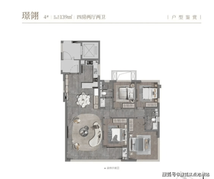 4号楼一共31层,1层架空,户型面积段更小,为119和139平,位于小区第二排,所以是北面对着中心园林,南向对着C地块规划的学校,可能会有学校的一些噪音影响。119平三房两卫为中间户,139平四房两卫为边户。这两个户型格局与三代宅很接近,不过由于得房率高,且都是独立电梯厅,所以私密性和空间感要好很多,139平与金茂樾满晴川的139非常接近,主卧多一个270°大转角窗,看过金茂的可以自行脑补,这两个户型都可以牺牲一间房做大横厅,看个人喜欢,不过小区是精装修,要咨询一下开发商如何改动。