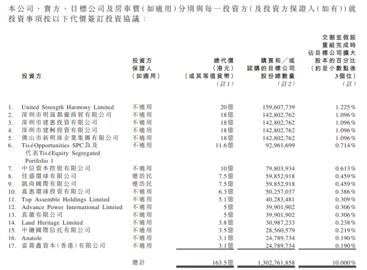 公告显示,投资方共17名,包括赵令欢旗下United Strength Harmony Limited、王伟民旗下深圳市明晟都灵商贸有限公司、王丽萍旗下深圳市建惠投资有限公司、林雷旗下深圳市建轲投资有限公司、叶德林旗下佛山市新明珠企业集团有限公司,大湾区深港证券有限公司投资的Tis é Opportunities SPC、中信资本、连浩民旗下佳盛环球有限公司、大圣资产管理有限公司管理的Dol-Fin PHL Fund SPC控制的凯尚国际有限公司、王忠明旗下嘉惠环球投资有限公司、郑家纯家族的Top Assemble Holdings Limited;以及恒大集团副主席兼行政总裁夏海钧旗下Advance Power International Limited、与联合能源集团有限公司有关联的真澈有限公司、Land Heritage Limited、中融国际信托有限公司、金鑫、毛飞勇及陈奕帆旗下的富乔鑫资本(香港)有限公司。