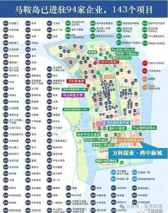 而马鞍岛,是大湾区的产业高地。从交通、产业、城市建设等方面对标前海,承接深圳高端产业转移和资源外溢,将成为总部经济、金融商务、科技服务、会展创意、工业设计等现代服务业的集聚高地。目前,重点产业含生物医疗(康方医疗科技园 等)、高科技产业(哈工大机器人研究院等)、 总部企业(华润燃气大湾区总部、名创优品亚太 国际总部等)。