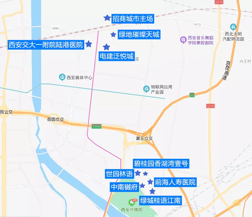 2、西安交大一附院陆港医院:位于秦汉大道与欧亚大道交汇处西南侧,总占地近375亩,设计床位1000张,是集医疗、教学、科研、预防保健等功能为一体的国际化三级综合医院。