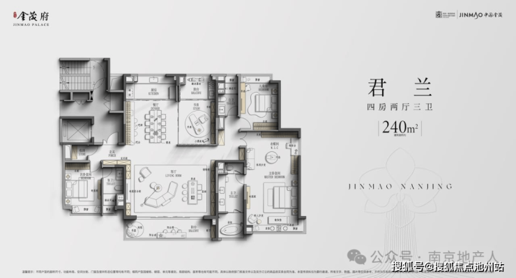 建面约240㎡四房两厅三卫户型,双向阳台